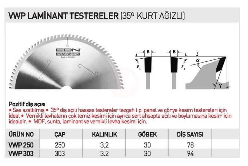 EDN Laminant Daire Testere Bıçağı VWP 250x3,2x30 mm 78 Diş - EDNVWP25078